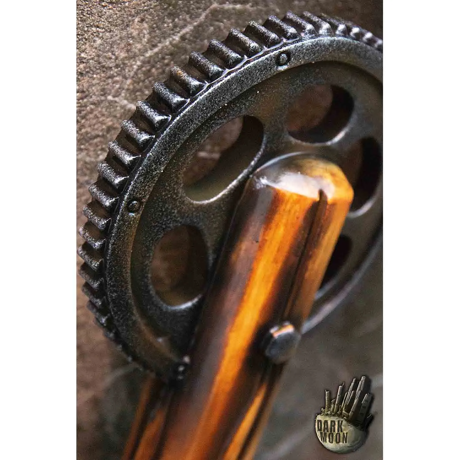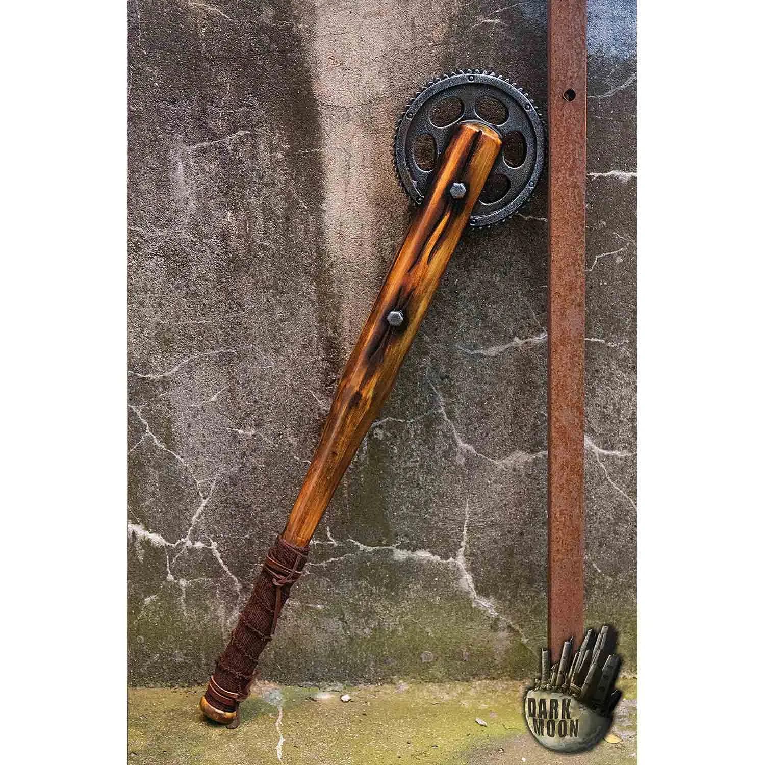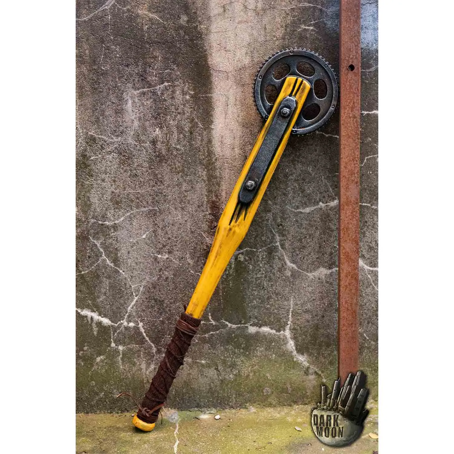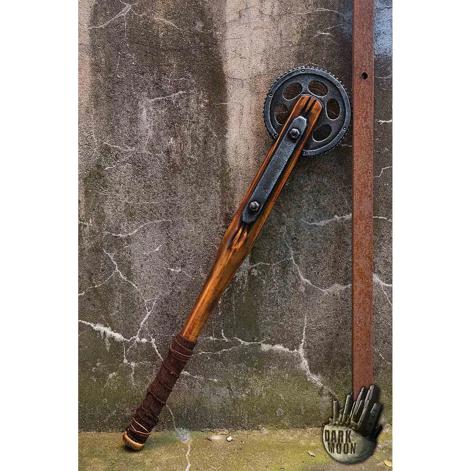 This 87 cm long Cog Bat has a 17 cm handle wrapped in ragged burlap and leather strings and features the typical baseball bat knob at the end. The rest of the bat is hand painted like wood grain with faded colouring and an impressive metallic gear fixed with metal mounts right smack on top.Made from durable closed cell foam around a 10 mm solid fibreglass rod and finished with a strong latex coating, this bat will be a great addition at your next futuristic or post-apocalyptic LARP game or cosplay.INSPIRATION