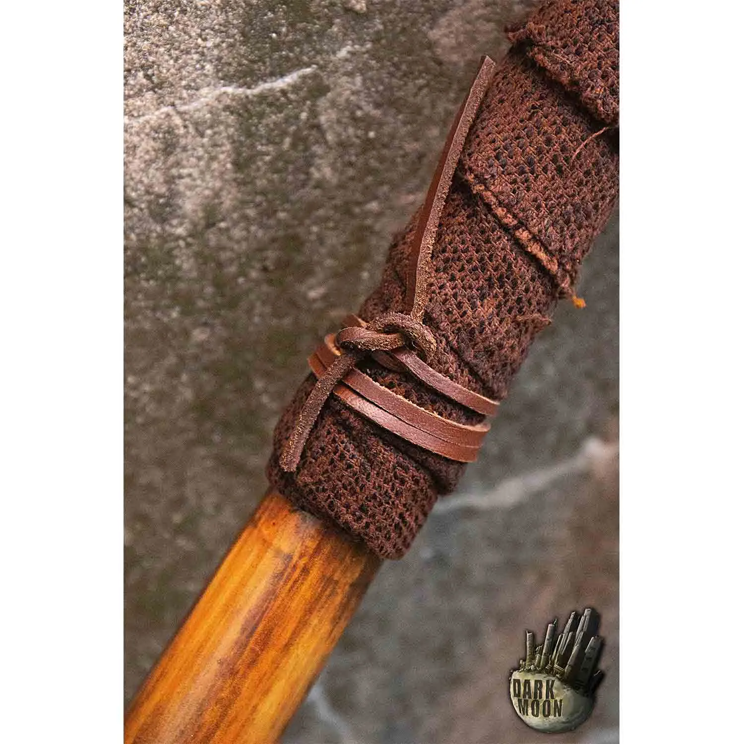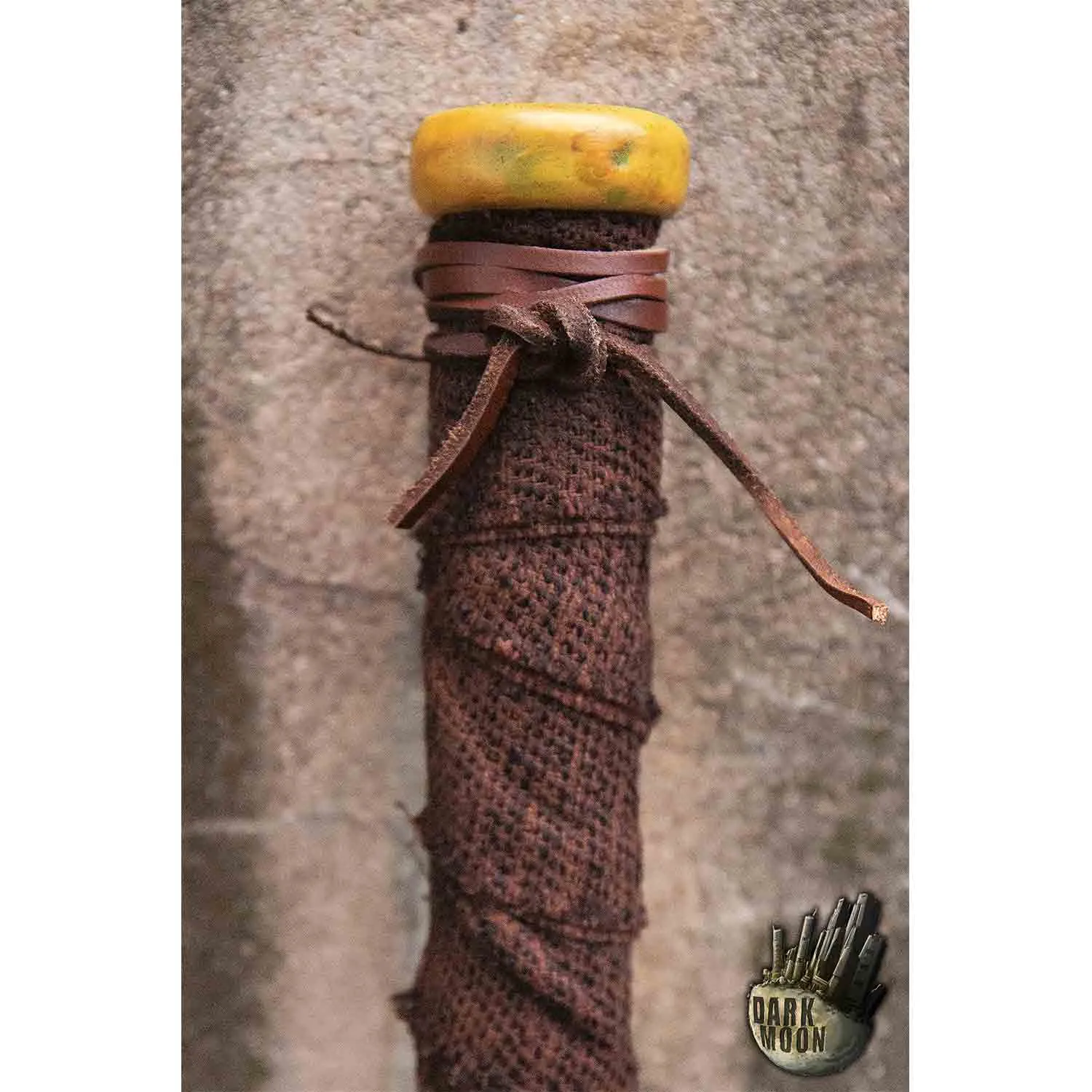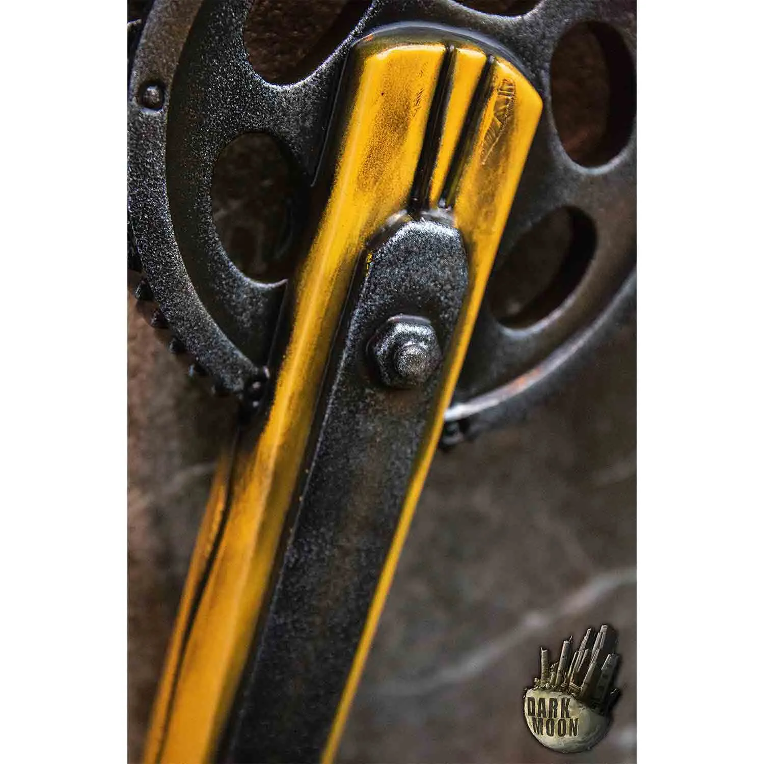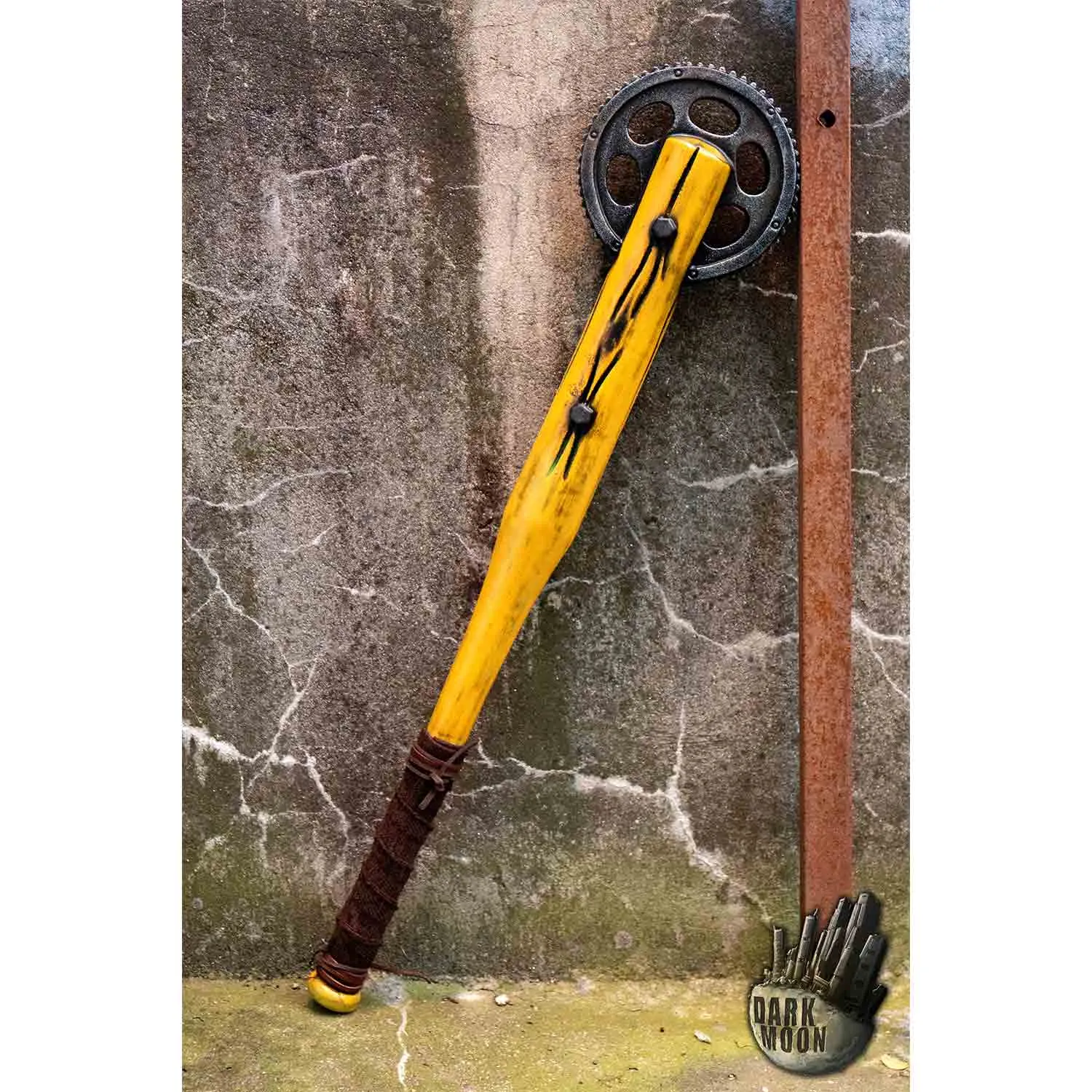 This 87 cm long Cog Bat has a 17 cm handle wrapped in ragged burlap and leather strings and features the typical baseball bat knob at the end. The rest of the bat is hand painted like wood grain with faded colouring and an impressive metallic gear fixed with metal mounts right smack on top.Made from durable closed cell foam around a 10 mm solid fibreglass rod and finished with a strong latex coating, this bat will be a great addition at your next futuristic or post-apocalyptic LARP game or cosplay.INSPIRATION