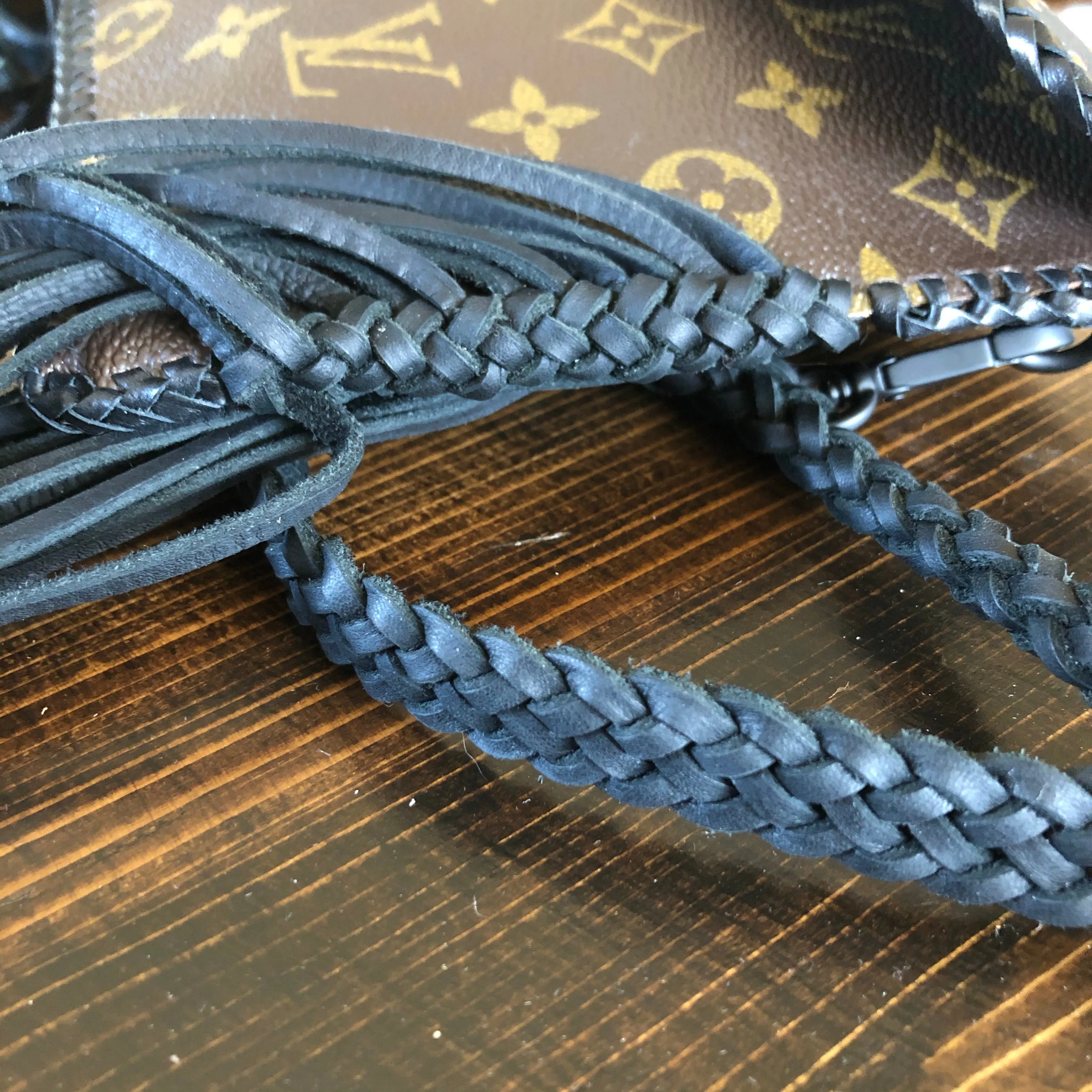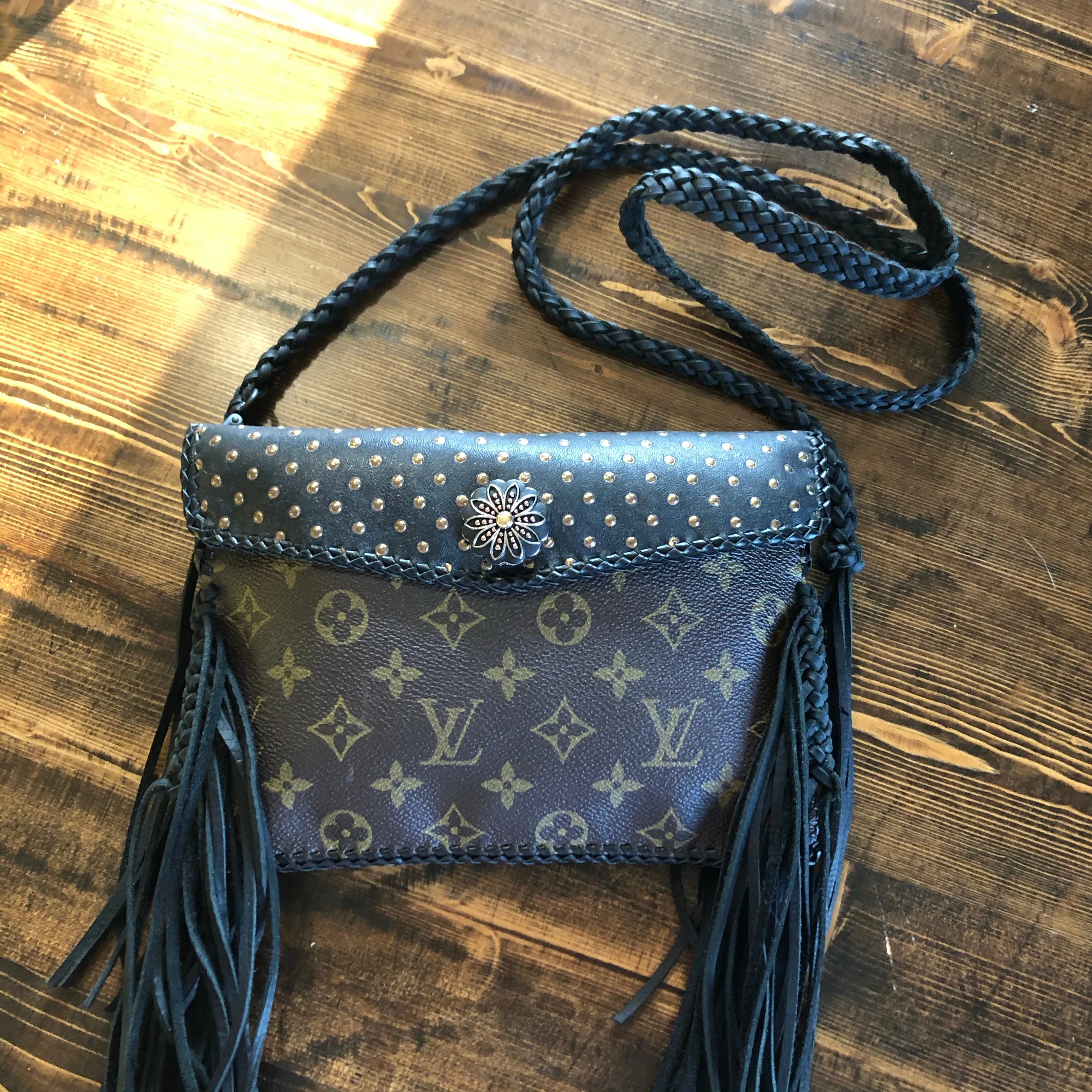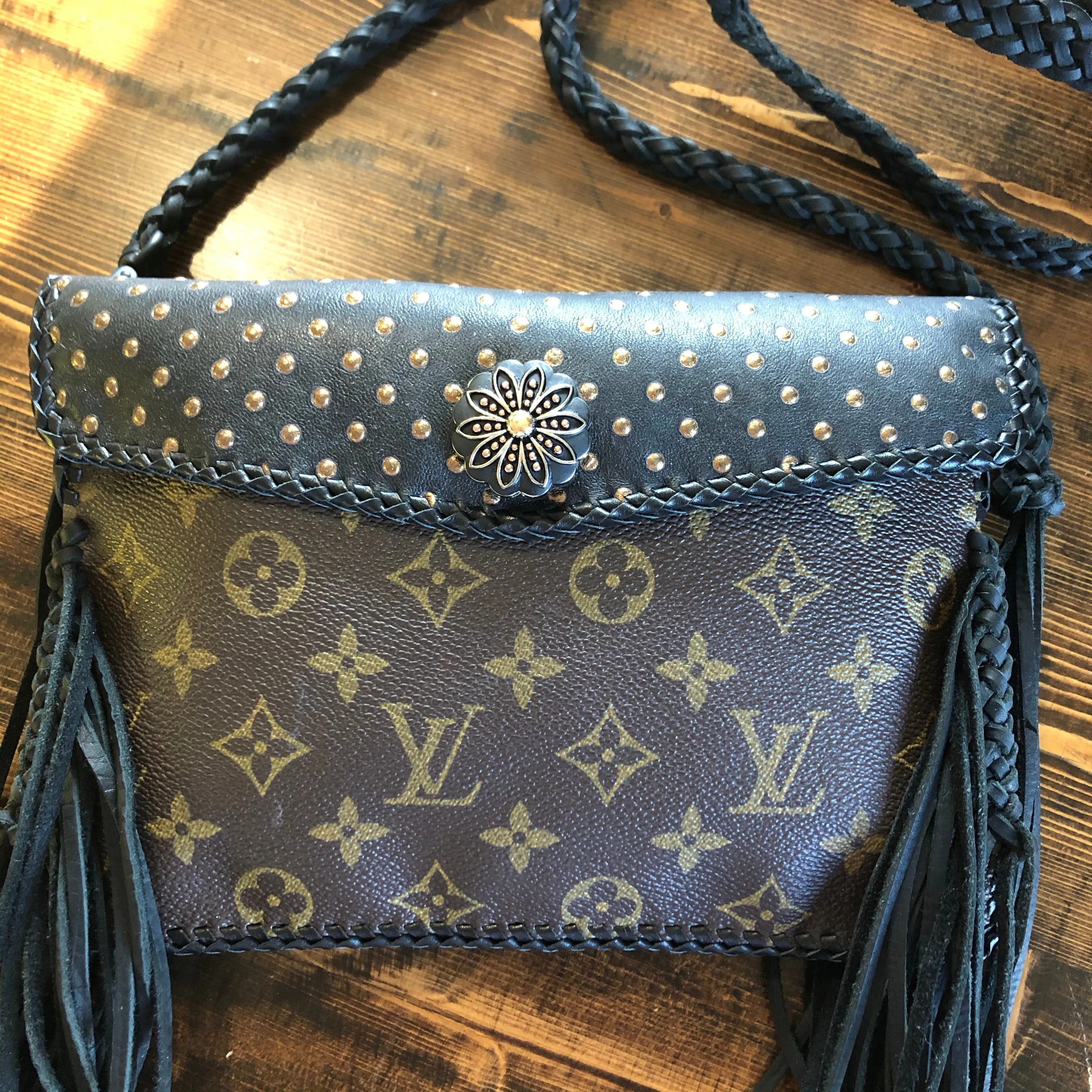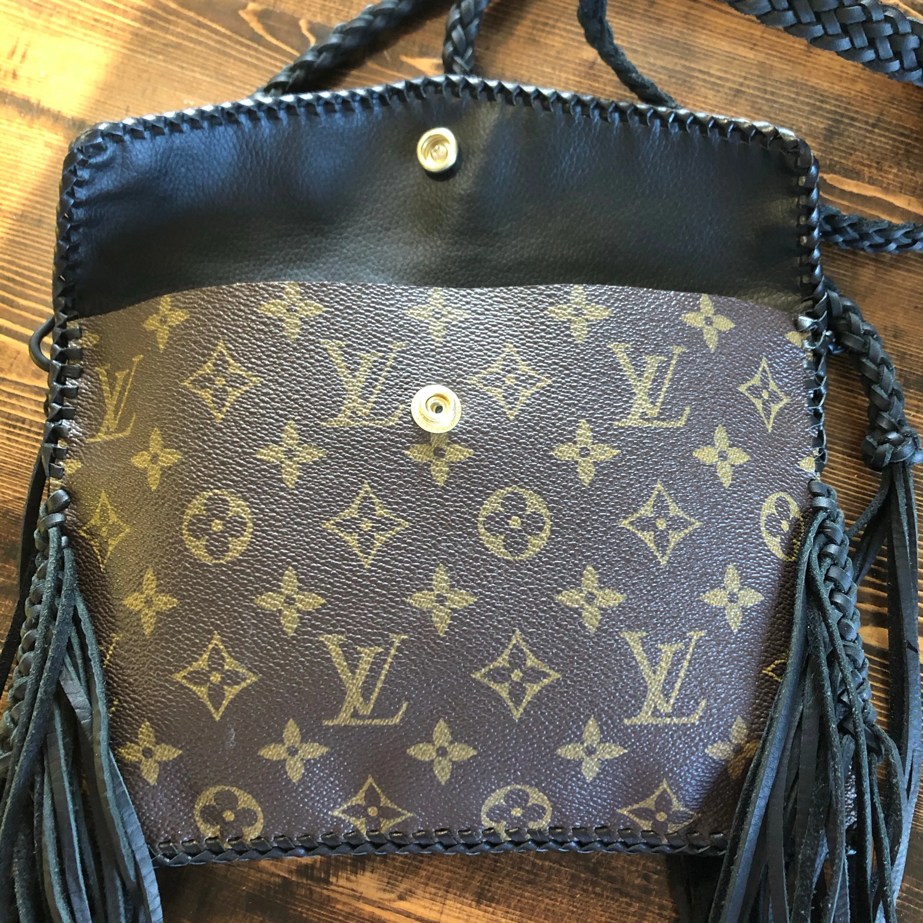 The entire bag is lined in a black leather, which makes the LV canvas more substantial. There is just one compartment inside. The outside edges are black leather lace which have been stitched by hand. There is also beautifully braided black leather fringe on both sides of the bag that hangs down about 8" from the bottom of the bag (this can be trimmed to your liking). The braided 6-strand black leather strap is perfect to wear crossbody (48"). It has a flat section that sits comfortably across your body, and then moves into a round section towards the clasp. The front closure is a matching concho snap, but can be changed out if you want something else. The hardware is brass and is coated with PVD Black (see below for description).
