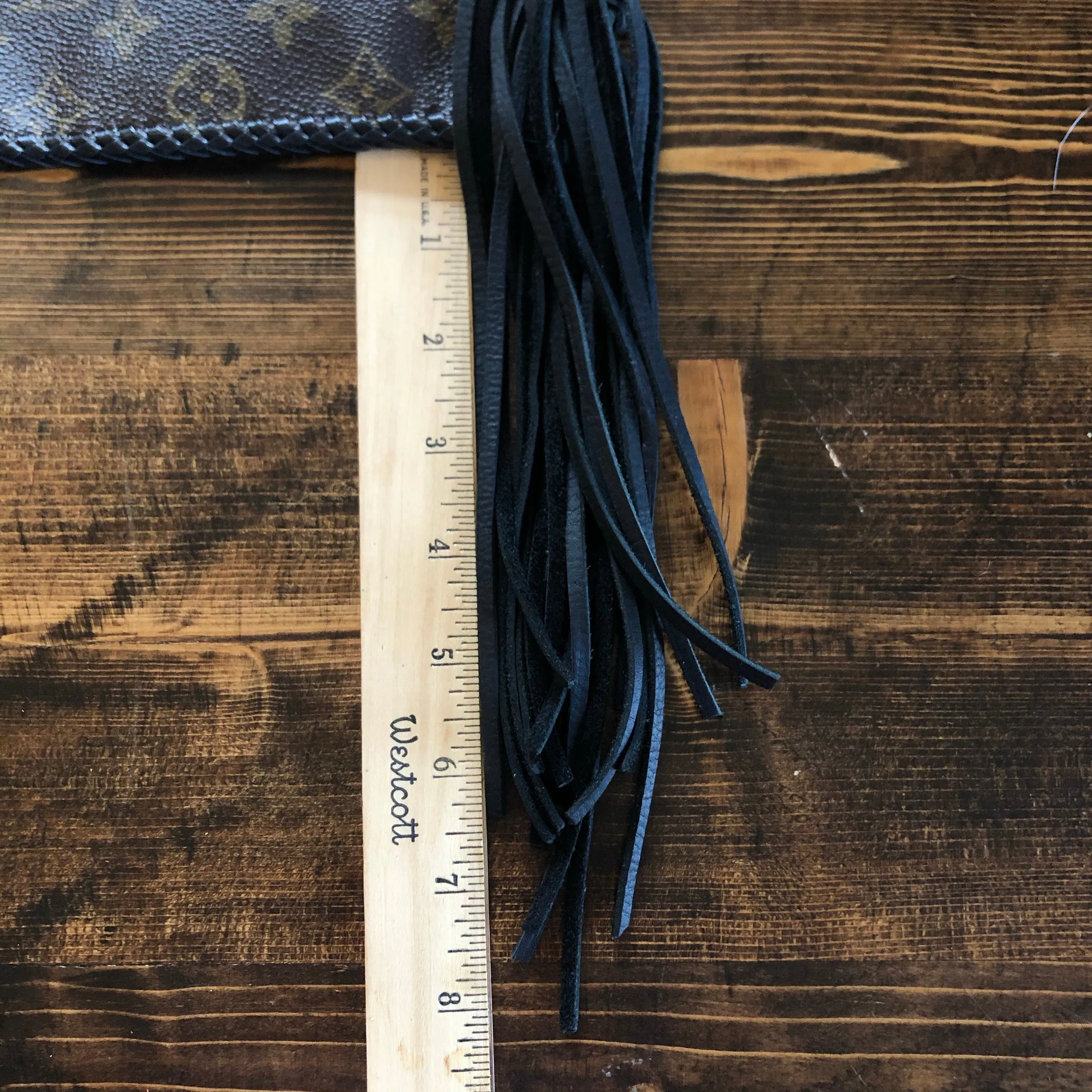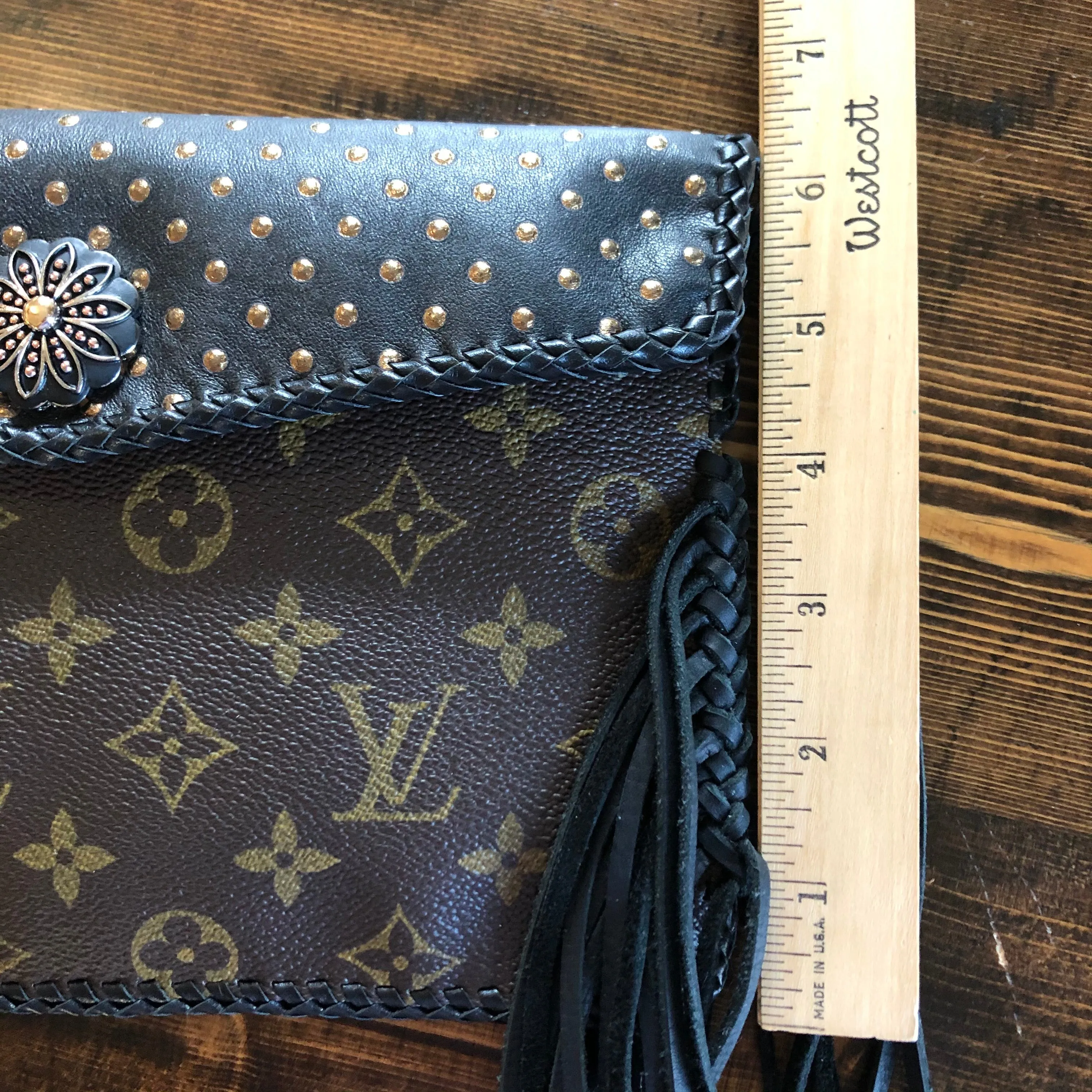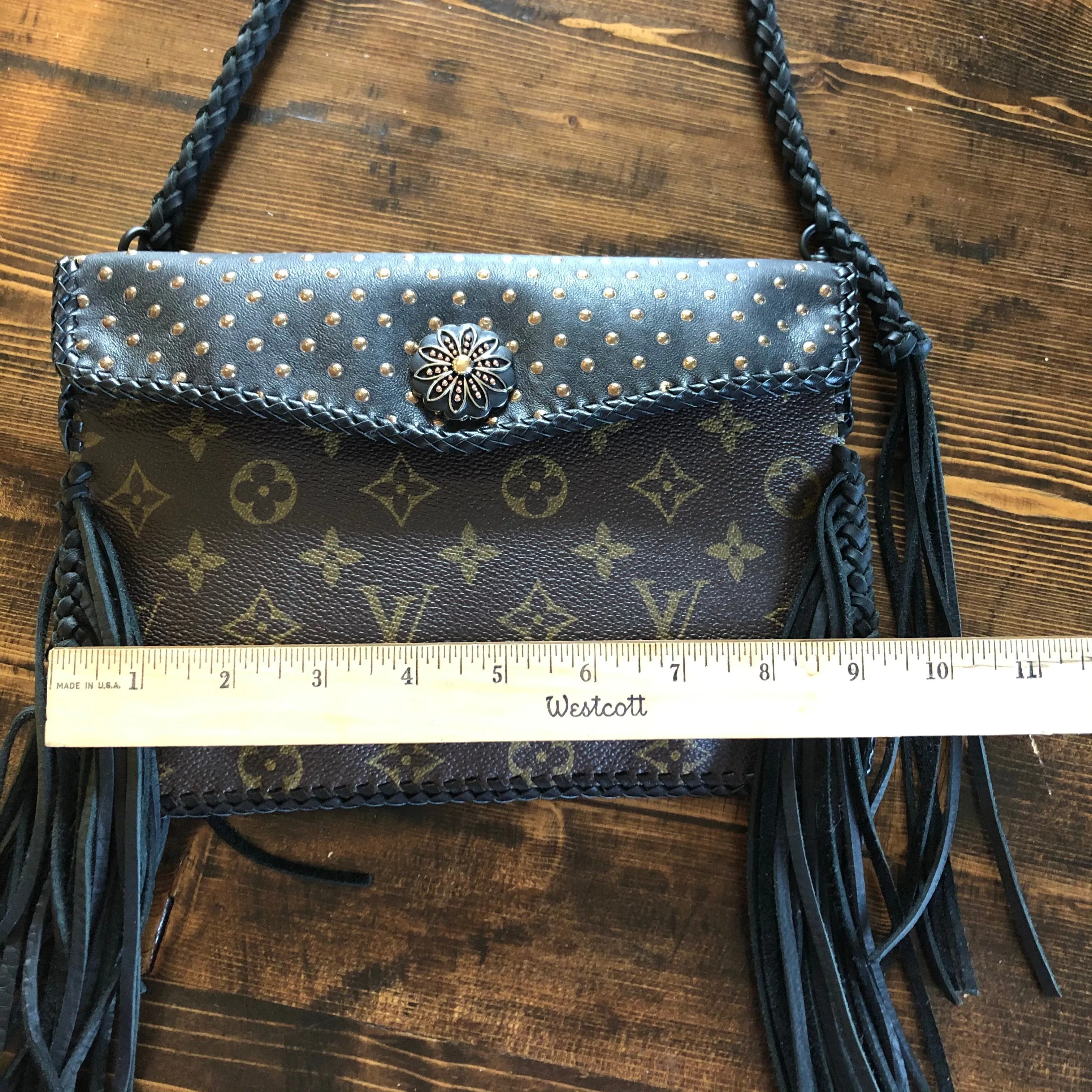 The entire bag is lined in a black leather, which makes the LV canvas more substantial. There is just one compartment inside. The outside edges are black leather lace which have been stitched by hand. There is also beautifully braided black leather fringe on both sides of the bag that hangs down about 8" from the bottom of the bag (this can be trimmed to your liking). The braided 6-strand black leather strap is perfect to wear crossbody (48"). It has a flat section that sits comfortably across your body, and then moves into a round section towards the clasp. The front closure is a matching concho snap, but can be changed out if you want something else. The hardware is brass and is coated with PVD Black (see below for description).