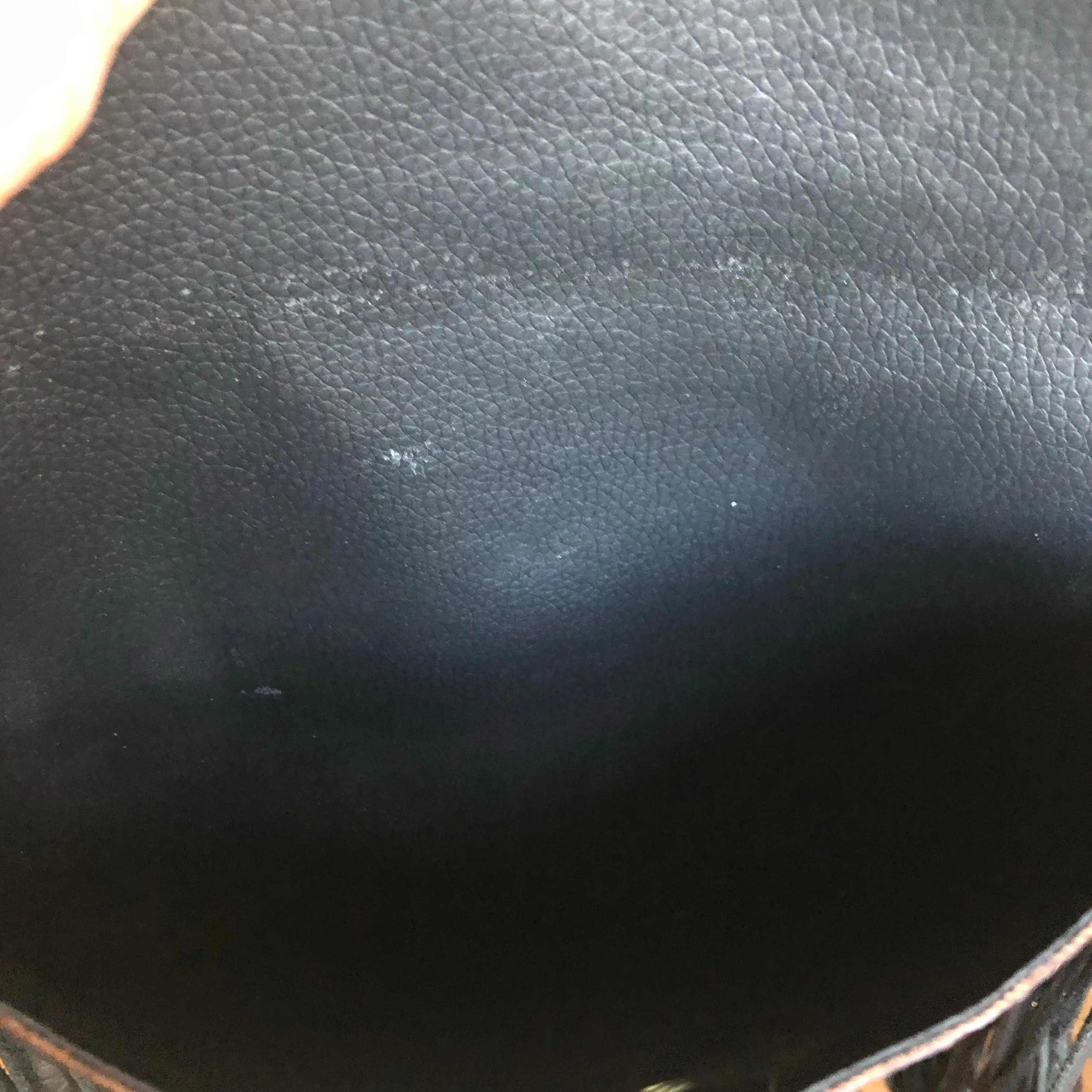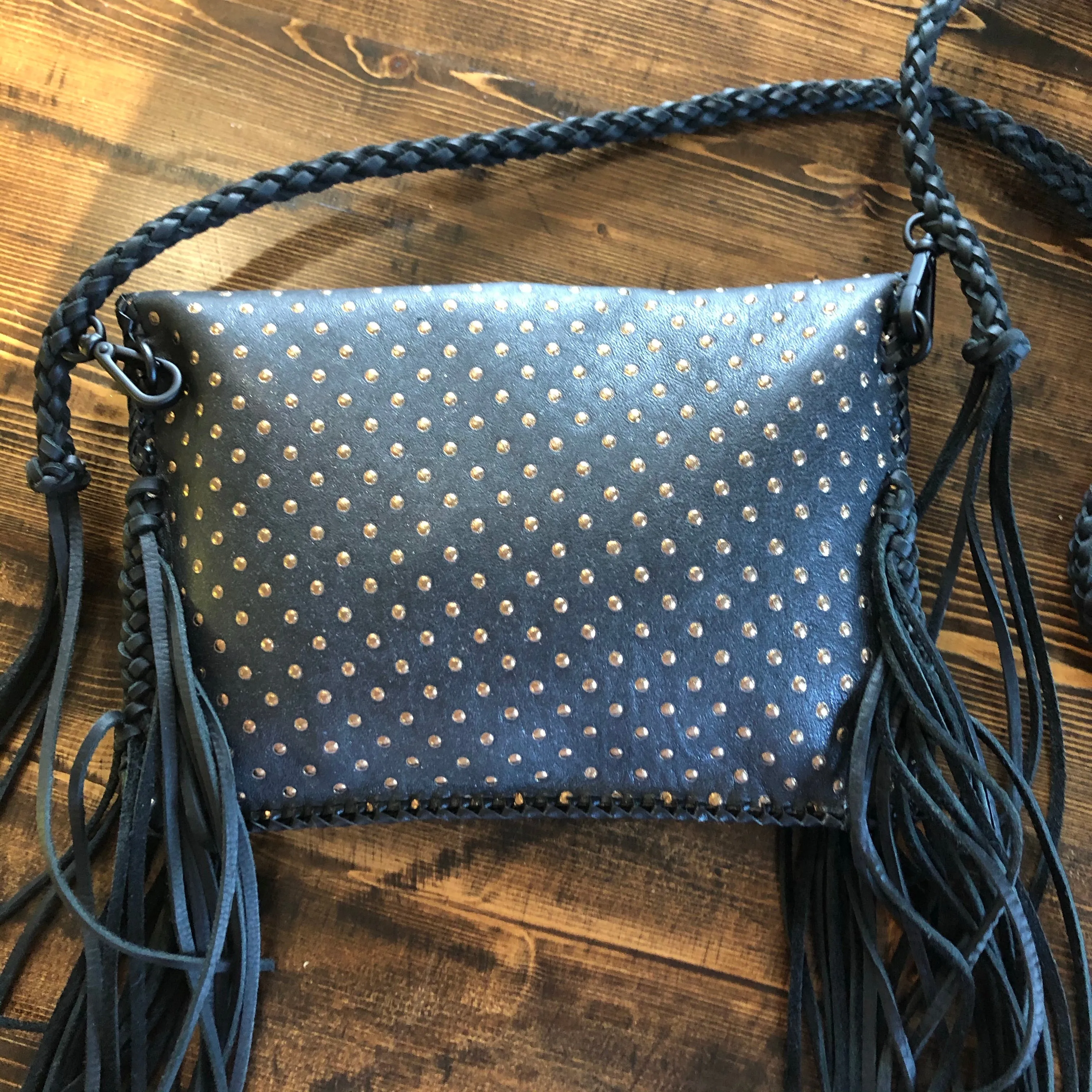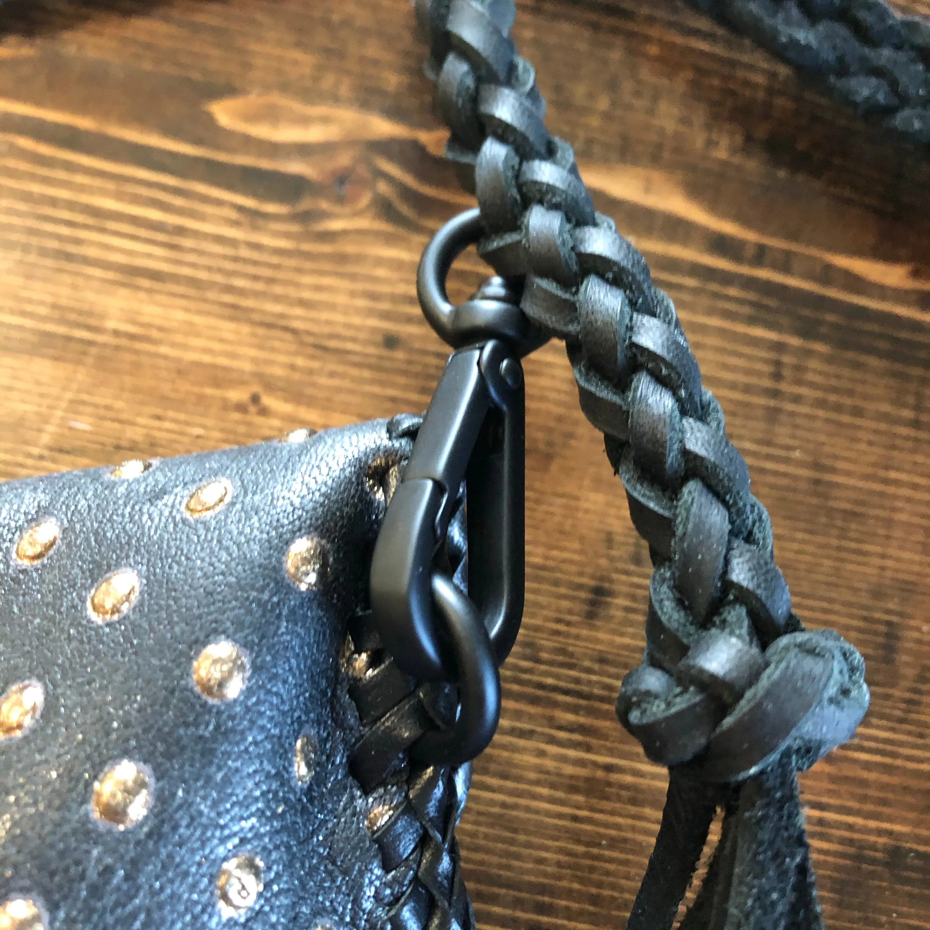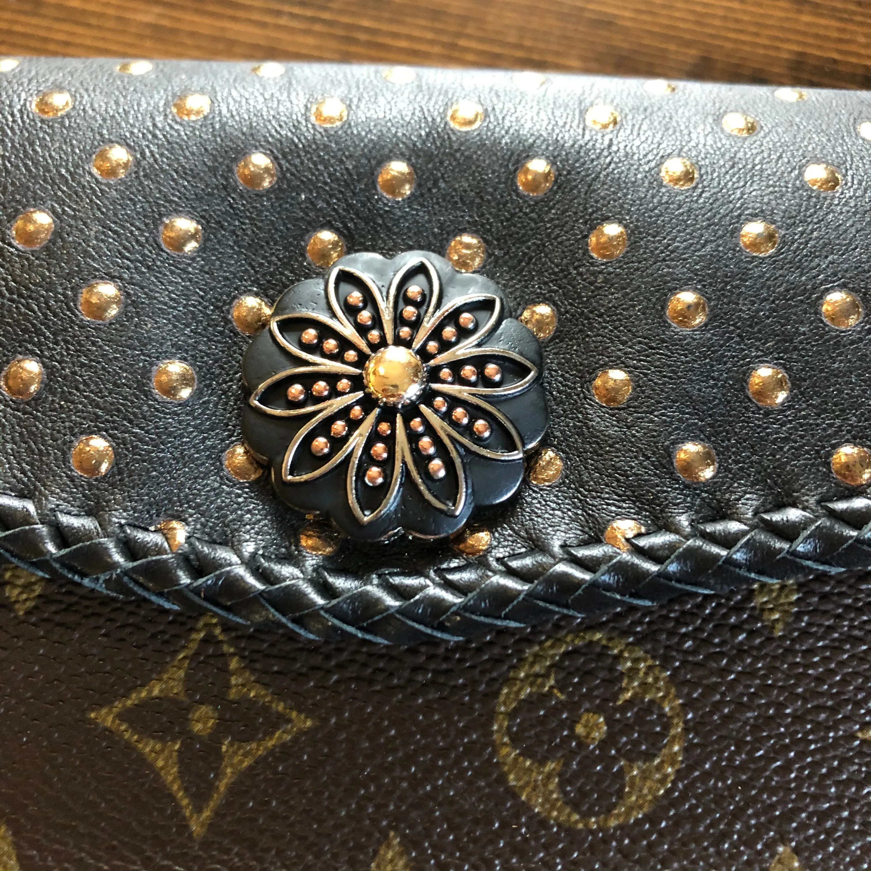 The entire bag is lined in a black leather, which makes the LV canvas more substantial. There is just one compartment inside. The outside edges are black leather lace which have been stitched by hand. There is also beautifully braided black leather fringe on both sides of the bag that hangs down about 8" from the bottom of the bag (this can be trimmed to your liking). The braided 6-strand black leather strap is perfect to wear crossbody (48"). It has a flat section that sits comfortably across your body, and then moves into a round section towards the clasp. The front closure is a matching concho snap, but can be changed out if you want something else. The hardware is brass and is coated with PVD Black (see below for description).